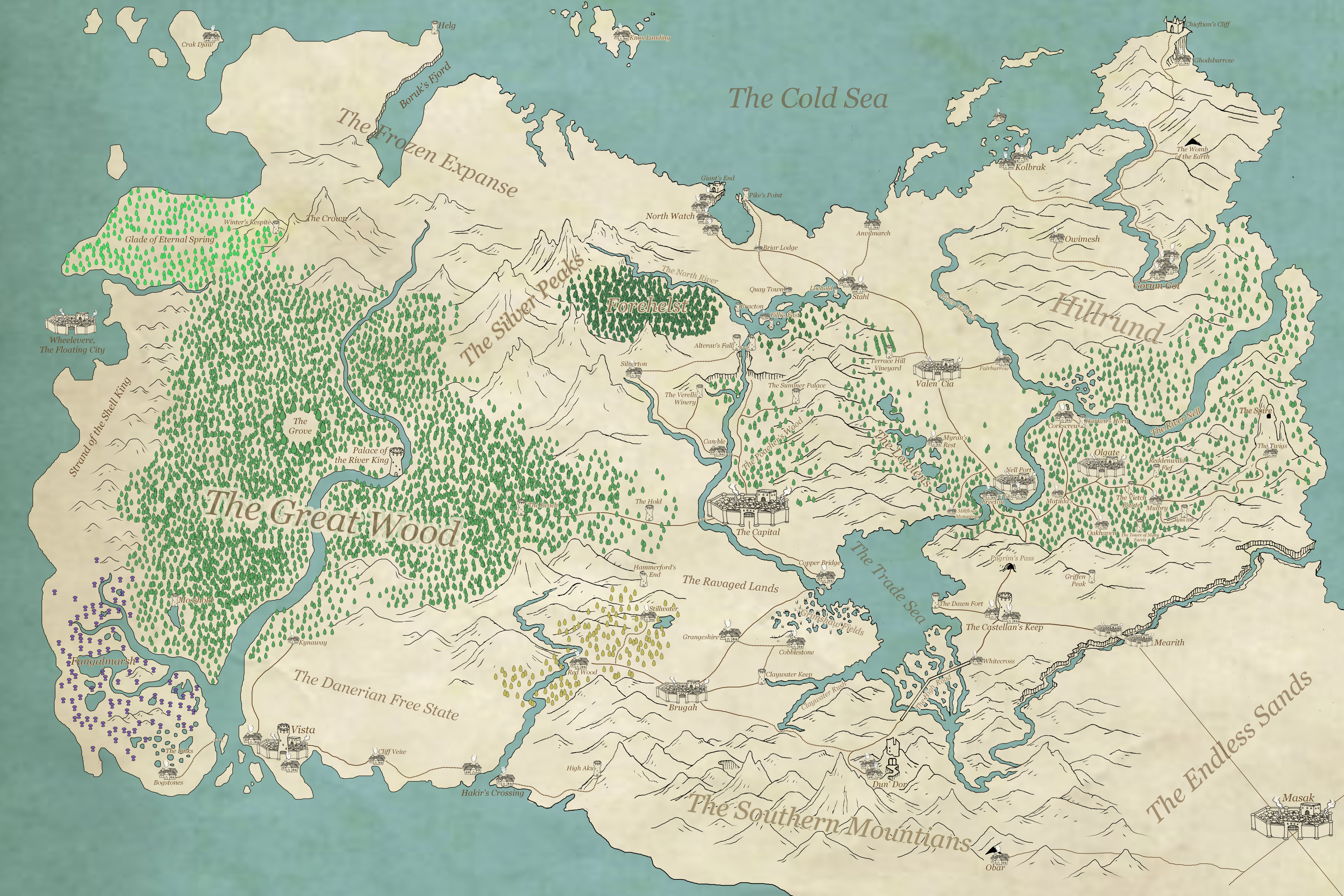 -A Map of the World of Nell campaign setting that is detailed in the Versus, Role-Playing Game fantasy add-on.